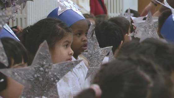 This year NQT teacher Catherine Morgan has rewritten the traditional nativity story, integrating all of the school?s ethnic groups and faiths. Pupils create a cultural extravaganza with a variety of regional customs represented, and Bollywood dancing features alongside Jesus, Joseph and Mary.